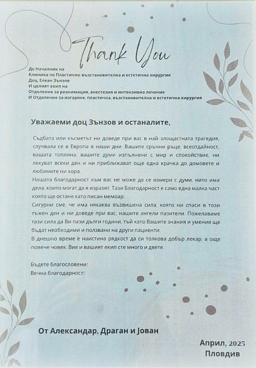 Съдбата или късметът ни доведе при Вас в най-злощастната трагедия в Европа в наши дни. Вашите сръчни ръце, всеотдайност, Вашата топлина, Вашите думи, изпълнени с мир и спокойствие, ни лекуват всеки ден и ни приближават още една крачка до домовете и любимите ни хора. Нашата благодарност към Вас не може да се измери с думи, нито има дела, които могат да я изразят…“ – А., Д. и Й.